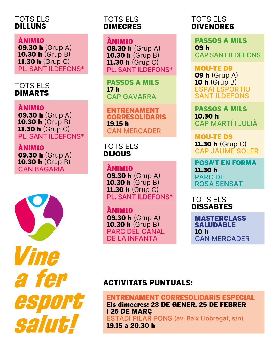 Ànim10 (treball cardiovascular i condicionament físic general) es fa en 16 grups diferents, en espais com al davant de Can Bagaria, al parc del Canal de la Infanta, i a la plaça de Sant Ildefons (aquestes es traslladaran a partir de febrer a Can Mercader). A banda, es continuen programant activitats setmanals com Passos a Mils (caminades guiades per diferents barris de la ciutat, en tres horaris i rutes diferents), la Masterclass saludable a Can Mercader els dissabtes al matí, Posa’t en Forma els divendres al parc de Rosa Sensat, i l’Entrenament Corresolid@ris a adreçat a runners de qualsevol nivell. De l’activitat Mou-te D9 (per a persones que han estat inactives i volen recuperar el ritme), hi ha ara 3 grups, els divendres al matí (dos a davant l’Espai Esportiu Sant Ildefons i un davant del CAP Jaume Soler).